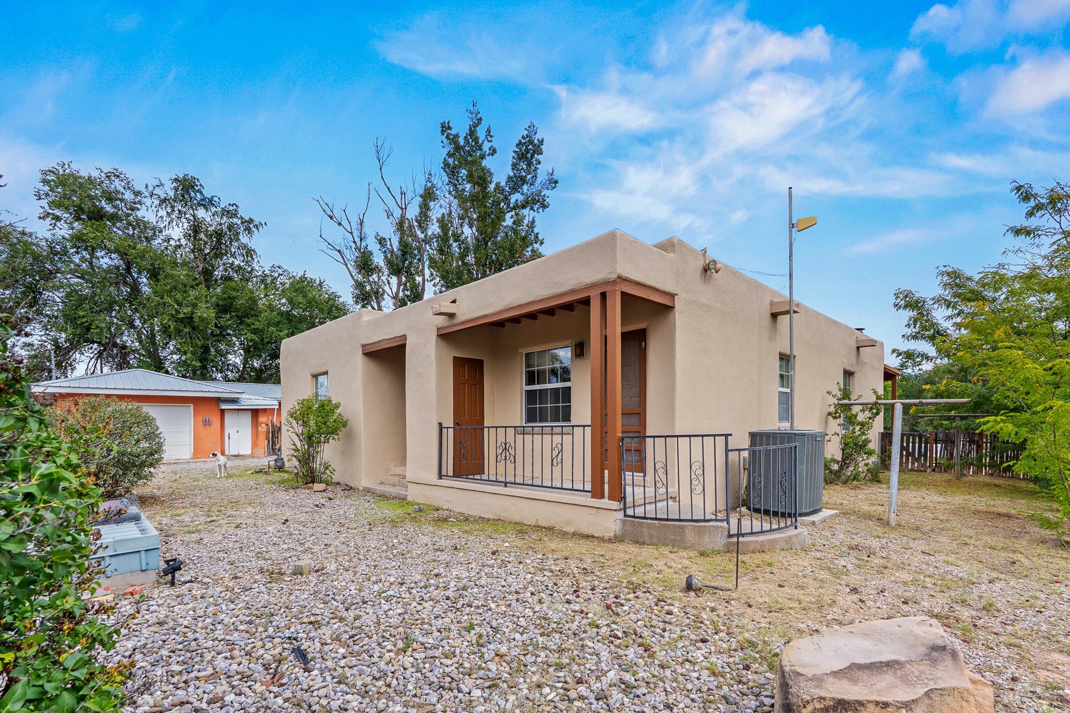 Unique Nambe property featuring a 3-bed, 1 full & 3/4 bath main home plus a private guest house. Owned solar conveys with sale, along with forced-air heating and central A/C for year-round comfort. Main house offers a cozy wood-burning stove and spacious layout. Guest house includes a room, kitchenette, full bath, and traditional kiva fireplace--perfect for guests, rental income, or multigenerational living. Enjoy Southwestern charm with modern efficiency in a serene setting.